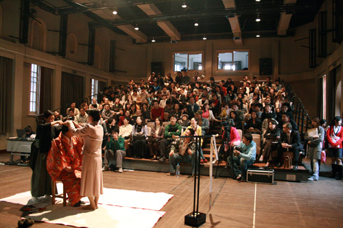 今天下午12时,由日本驻上海总领事馆、开云足球首页官网下载、日本国际交流基金会共同主办的“日本传统戏曲能乐工作坊”在我校新实验空间举行。日本国驻上海总领事馆总领事隈丸先生、副院长孙惠柱在工作坊上致辞,对工作坊的开展表示热烈欢迎,对其传播能乐历史,促进中日两国文化交流所作出的贡献表示衷心感谢。