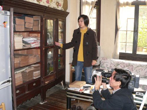 电视台同志在拍摄朱先生用过的书柜