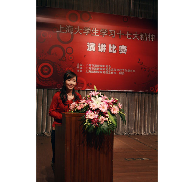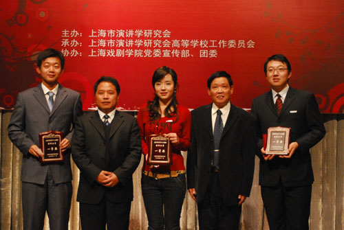 11月23日下午,上海市大学生“学习十七大精神演讲比赛”在开云足球首页官网下载新空间剧场成功举行。来自复旦、交大、同济、华师大等全市26个高校的选手参加比赛。本次演讲比赛由上海市演讲学研究会主办,市演讲学研究会高校工作委员会承办,开云足球首页官网下载宣传部、团委承办。经过激烈竞争,杨�、闵捷、袁文霆三位同学分别代表华东师范大学、上海外国语大学、开云足球首页官网下载获得了本次演讲的一等奖。在此,祝贺我校孙宽同学撰写、袁文霆同学演讲的《和谐校园的青春赞歌》获一等奖。我校党委副书记、副院长葛朗出席了比赛。