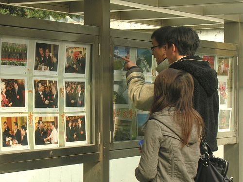 图为莲花路同学们观看十七大精神宣传栏