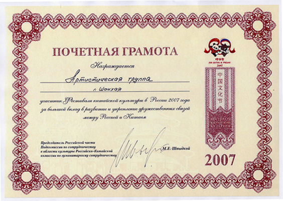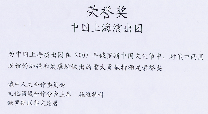 2007年12月12日上海市文广局领导及有关部门为我校舞蹈学院2007年9月1日―27日赴俄罗斯参加中俄文化年“中国年―伏尔加河艺术之旅”访问演出的学生演员举行庆功会,高度赞扬了我院学生在活动的精湛舞艺,并向舞蹈学院领导转发了俄中人文合作委员会主席――施维特科颁发的荣誉证书。