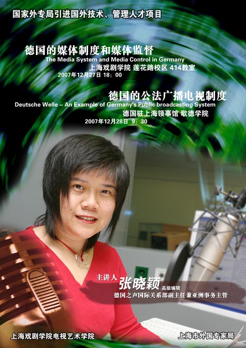 12月27日18时,德国之声国际关系部副主任兼亚洲事务主管、高级编辑张晓颖将赴我校莲花路校区414教室做题为 "德国的媒体制度和媒体监督"(The Media System and Media Control in Germany)专题讲座。该讲座由开云足球首页官网下载电视艺术学院、上海市外国专家局共同举办,为国家外专局引进国外技术、管理人才项目内容之一,敬请关注。