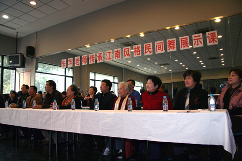 展示课后,大家意犹未尽,来宾与舞校青年教师进行了座谈。离休干部陈明老师按捺不住激动的心情说:“上戏和舞校领导邀请朱苹老师回来具有战略眼光,为民间舞输入了新鲜血液。民间舞教师要不断深入民间,取其精华,去其糟粕,不断丰富舞校教材。”舞蹈教育专家杨威兴致极高:“朱苹太不容易了,她很执著地整理江南风格舞蹈,传承不仅要传动作,更重要的是传精神,需要心定下来做教材,朱苹老师开了头,其他教材也要编。”老教师陈学春和岑爱斌动情地说:“朱苹老师宝刀不老,江南风格的民间舞很有味道。希望教员在一起不仅学习江南风格民间舞,也要对其他进行教研交流,提高教学水平。这一次展示让我们看到了舞校老教师的风采和年轻教师的起点。”中国舞科科长助理、民间舞教研组长李�说:“这次进修,我们学到了朱苹老师严谨的教学态度和独特的教学方法。江南风格是我校的特色,我们必须继承。”青年教师李涛说:“我站在中间,压力很大,朱苹老师能够敏锐的感觉到动作的每一点瑕疵。我是中央民族大学毕业的,从来没有接触过江南风格的民间舞。朱苹老师从不会晚一秒钟进教室,但她会选择不吃中饭,朱苹老师高尚的师风、师德、师貌给我们留下了深刻的印象。”舞校名誉校长胡蓉蓉说:“朱苹老师来得很及时,年轻教师的表现是多年未见,希望能继续,其他科室都应该进修,年轻教员要上舞台,朱苹老师的敬业精神和教学方法都需要学习。希望民间舞教师下生活,以鲜活的素材来发展民间舞。”