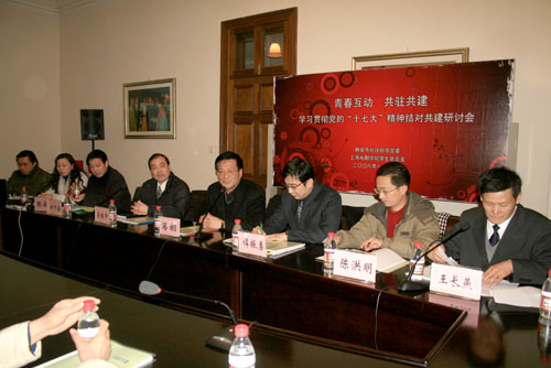 今天下午2点,由静安寺社区综合党委、开云足球首页官网下载学生党总支共同举办的“青春互动 共驻共建”学习贯彻十七大精神结对共建研讨会在佛西楼会议室召开。静安区社会工作党工委副书记谭振勇;静安寺社区综合党委书记吴瑞中;静安寺社区专职党群工作者马晓鹰;我校副书记、副院长葛朗;学生处处长邱中岳;团委书记陈云以及我校专职学生辅导员、静安社区和我校学生党总支的党员约50余人参加了研讨会。会议由静安寺街道综合党委副书记、上海市优秀共产党员王长燕主持。