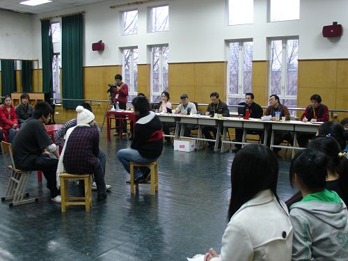 1月19-20日上海市教育考试院组织的上海市普通高校表演类专业统一考试在我校莲花路校区举行。372名考生将在两天内完成声乐、台词、形体、表演4个科目的考试。在上海市教育考试院卢致杰老师现场指导下,考试在宽畅明亮的练功房进行,楼外冬雨沥沥,考场内春意盎然,考生们在监考的引领下,有序地进入候考场热身,再进入考场展示才艺。来自上海市各高校艺术类专业的专家严肃、认真、规范地考核评分,摄像人员详细地全程录制考试的情况,电脑操作人员紧张细致地统计考分,当场用投影仪打出每位考生的成绩。真实地展现了一幅“公开、公平、公正”的考试场景。考场外的媒体记者们饶有幸趣地�访着考生。