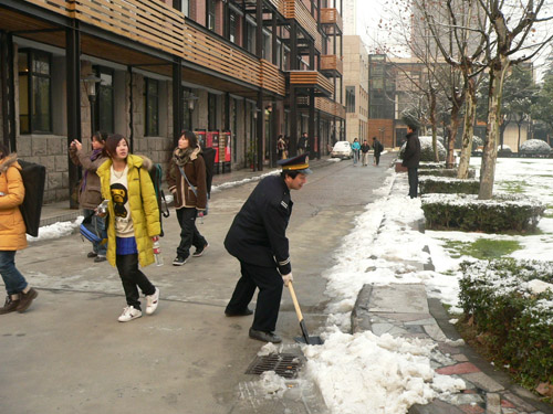 把雪铲得干净、再干净些,不能让一个考生摔跤