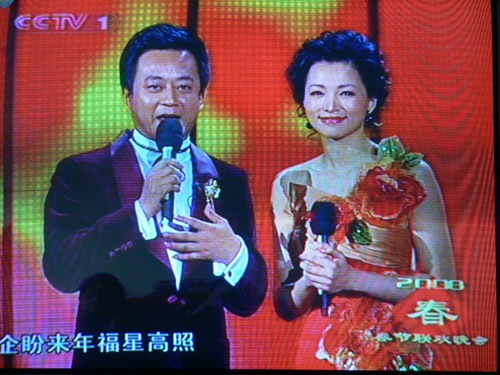 图为董卿与朱军共同主持春晚节目(摄自电视画面)