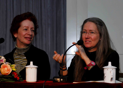 报告厅内聚集一堂,共有117位学员聆听大师的讲座。有的学员不顾一天的劳累,早早到报告厅,拿出了笔记本,认真记录大师的一言一语,并认真思考。有的还抢占有利位置,进行现场摄录。视频资料结束后,学员们抓住难得的机会,针对现代舞的核心是什么,对马莎・格兰姆影响最大的因素是什么,现代舞和当代舞的区别是什么等问题向主讲老师提问,洁瑞和唐娜・费做出了精彩而富有见地的回答,赢得了学员的阵阵掌声。计划晚上9时结束的讲座由于师生之间的热烈互动,延迟到晚9:10才结束。结束后,部分学员还在与专家积极交流着。(供稿:杨倩、张麟 摄影:周欢 佳奇 责编/雨田)