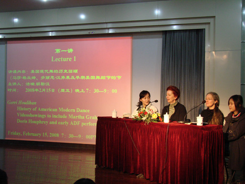 按照国际舞蹈大师教学计划,在大师授课期间,将安排四次专题讲座和若干次作品欣赏课。2月15日晚7:30分,经过了一天的辛勤授课,大师班的五位专家全部来到莲花路校区图书馆报告厅参加讲座。第一讲由美国舞蹈节资深教师洁瑞・胡勒汉主讲,她凭借着对美国现代舞历史研究造诣,与自身丰富的实践相结合,以题为《美国现代舞的历史回顾(马莎・格兰姆、多丽思・汉弗莱及早期舞蹈节)》,拉开专题讲座的序幕。