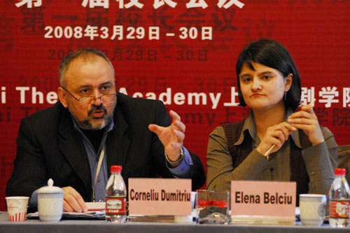 图为联合国教科文组织国际剧协戏剧院校委员会主席Corneliu Dumitriu先生在会上发言