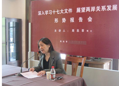 2008年4月25日下午2:00,统战部组织的 “深入学习十七大文件,展望两岸关系发展”――台海形势报告会在老干部活动室举行,报告会由上海国际问题研究所世界经济研究室主任周忠菲博士主讲。学院民主党派成员、无党派人士、党外教授、少数民族教师、侨胞、港澳台胞等统战成员聆听了报告会。