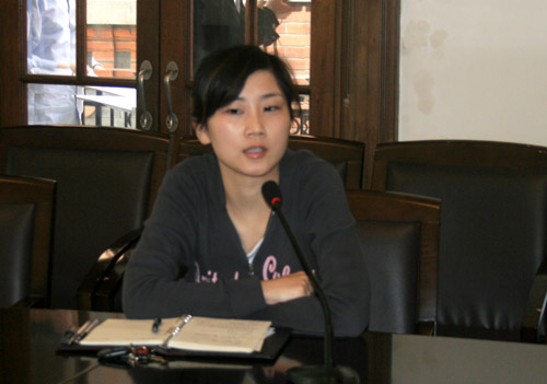 图为创意学院网络通讯员盛思梅在会议发言