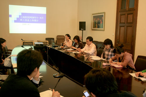 会上,王怿首先介绍了近期校报、校园网在学院发展中发挥的重大作用及积极意义。信息中心曾石如向大家强调了网络安全及管理方面的问题,信息中心雷雯介绍2008年1~4月间,校园网主页以及各院、系、部二级网页上传信息统计排名情况。