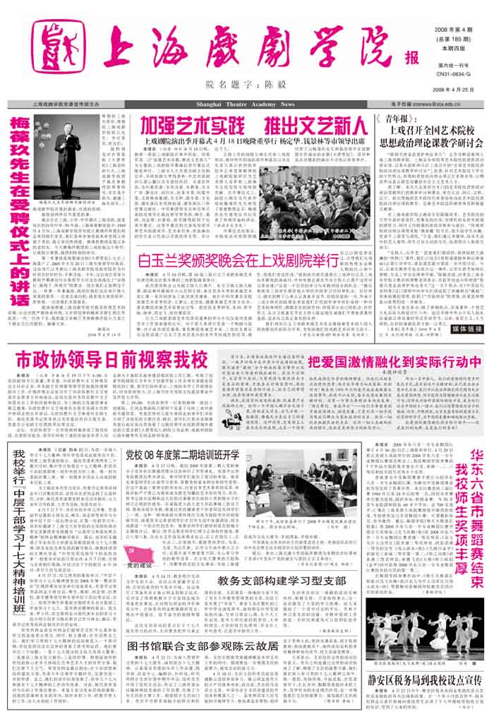 《开云足球首页官网下载报》2008年第4期已出版(总185期)已于4月25日出版。本期重点内容有:《加强艺术实践 推出文艺新人》、《梅葆玖先生在受聘仪式上的讲话》、《白玉兰奖颁奖晚会在上戏剧院举行》、《市政协领导日前视察我校》等,敬请关注。