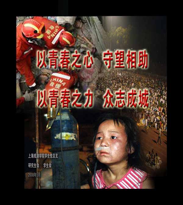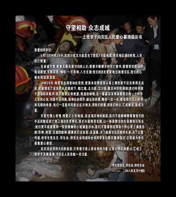 5月13日,校学生党总支、学生会、研究生会面向全校同学,发出赈灾募捐倡议,以班级为单位募集爱心善款,向四川灾区人民伸出援助之手。
