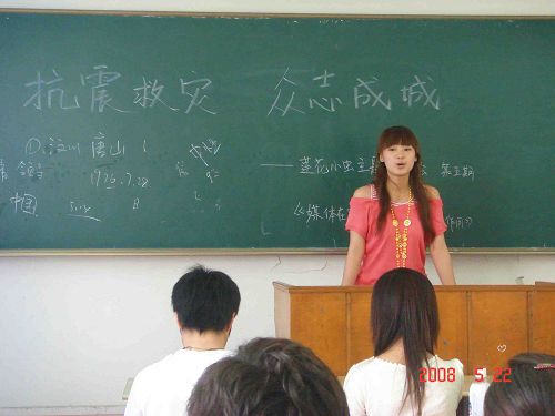不仅是电视媒体,指导老师魏燕玲为我们探讨了网络媒体的作用,她说媒体在地震中的报道基本做到三点“知、情、意”。“知”指媒体深入一线,发布信息、取舍信息。“情”指媒体通过对灾区的报道所要渲染的情感,比如无论在网上、电视上、手机报上,我们都会被触目惊心的画面、照片所打动,我们的心是沉重的,但却是紧紧情系灾区人民。“意”是指媒体对报道进程的意志,连续直播让受众直观、迅速了解灾区情况,灾区的一丝动静都牵动着我们的心。