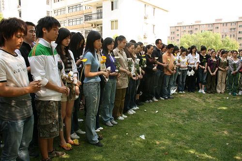 应国务院号召,2008年5月19日14时28分,我校莲花路校区200多名师生自发集合在校园的草坪上,为四川汶川大地震中死难的同胞默哀。
