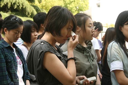 警笛声响起的时候,所有同学低下头,静静地向死者致以哀思。很多同学留下了眼泪。此刻的校园,没有了往日的欢声笑语,这一个个不幸被死神夺去生命的逝者,与活着的许多人既无亲,又无故,但是他是我们的同胞,他是我们的兄弟姐妹,他是我们的亲人,此时此刻,每一个致哀的人悲痛欲绝。我们为他们哭泣,我们为他们祈祷,愿他们安息。