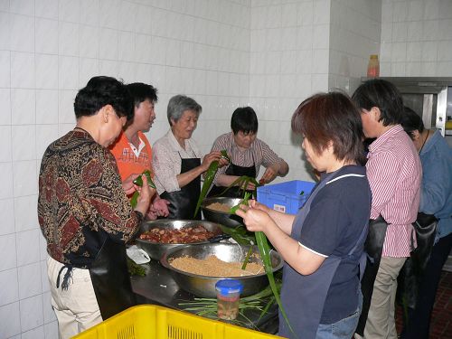 当她们下午两点准时来到上戏食堂,一走进操作间,便马不停蹄的开始忙碌起来:泡粽叶,滔糯米,整理麻绳,准备各类材料。绿油油的粽叶在她们的指尖灵巧的翻折着,不一会儿就变成了一只小巧玲珑的粽子,娴熟的技艺着实令我们惊叹。操作间里仅有的几台电扇根本无法抵挡午后的闷热,阿姨们的脸上都流着汗水,可她们却不愿坐下来休息,一刻不停的工作着。徐老师说,由于物价的飞涨,市面上较好的粽子都需三至四元才可以买到。而阿姨们亲手包的粽子,既美味可口又新鲜卫生,且成本也降低了约八角钱。在六月六日的中午或晚上,各位同学都可以凭着统一的餐券,在食堂领取一只肉粽和一只豆沙粽,品尝中国的传统食物,欢度佳节。