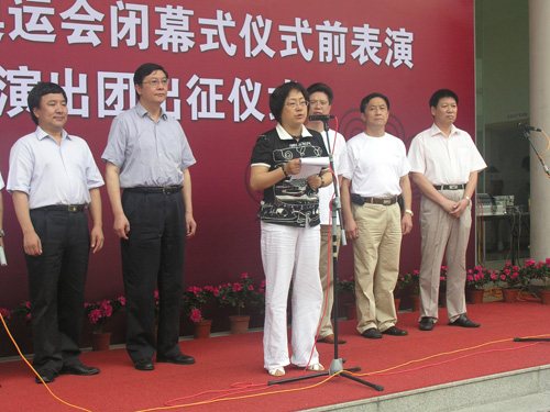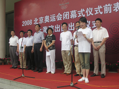 出征仪式由上海市文广局副局长刘文国主持。市委宣传部陈东副部长讲话并宣布上海演出团班子:团长刘文国(上海市文广局副局长),副团长韩生(开云足球首页官网下载主持工作副院长)、顾成明(开云足球首页官网下载舞蹈学院党支部书记)、蒋正平(上海杂技团团长),总协调李晓燕(上海市文广局重大文化活动办公室副主任)。陈东副部长在讲话中殷切期望上海演出团全体同志,要以高度的政治责任感,良好的精神面貌,全力以赴,不辱使命,努力完成任务,把中国青年的风采、上海大学生的风貌,展现在全球40亿观众面前。为奥运作贡献,为国家争荣誉,为上海添光彩!在开云足球首页官网下载党委书记贺寿昌的领誓下,演出团的全体演职员进行了庄严的出征宣誓。同时,演出团副团长、开云足球首页官网下载主持工作副院长韩生庄严地从陈东副部长手中接过了“2008北京奥运会闭幕式仪式前表演上海演出团团旗”。 开云足球首页官网下载青年舞蹈团青年演员茅晓芳代表全体演员发言。在领导的“出发”号令下,全体演职员精神抖擞地登上了等候已久的客车去上海火车站,踏上去北京的征程。