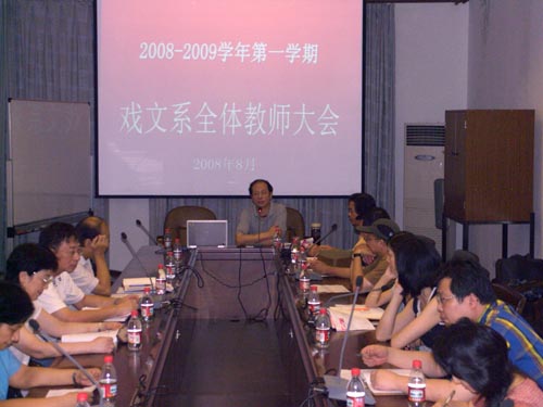 在度过一个愉快的暑假之后,8月29日下午,戏剧影视文学系20余名教师在紫藤庐聚集一堂,召开“2008-2009学年第一学期戏文系全体教师大会”,会议围绕上学期的工作总结和本学期的工作计划展开。会议由系副主任汤逸佩老师主持。系主任陆军老师、系党总支书记吴小钧老师,以及各教研室主任做了主题发言。与会老师畅所欲言,发表了建设性的意见和建议,同时对本学期的工作做了积极展望。