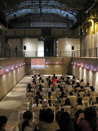 下午2时许,郑培光先生为创意学院的师生们作了精彩的演讲,主要介绍“红坊”和“半岛1919”两个项目的运营概况,讲述了“红坊”的经营模式,基于对老工业厂区的稳建改造,专业的软、硬件配套的同步跟上,才由此汇聚了一批创意精英,营造了一个高效便捷、人情浓郁的工作环境,从而成为了沪上创意产业新地标。而“半岛1919”和创意联盟2部分的讲述,则是以比较新颖的视角强调了创意产业链完整的重要性,只有要求进驻的团队,包括从原创到市场,形成一个完整链条,才能在坚固制造端的同时,把艺术和创意产品的展示、销售做好,才有可能带来旅游、餐饮、服务业发展的商业利润。