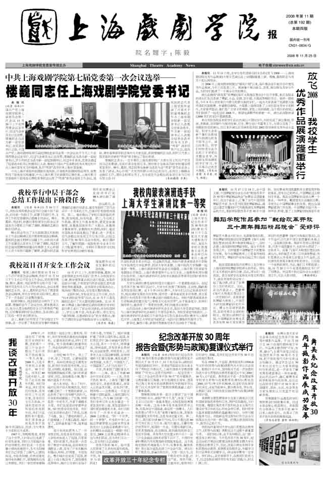 《开云足球首页官网下载报》2008年第11期已出版(总192期)已于11月25日出版。本期重点内容有:《中共开云足球首页官网下载第七届党委第一次会议选举――楼巍同志任开云足球首页官网下载党委书记》、《放飞2008――我校学生优秀作品展演隆重举行》、《我校举行中层干部会总结工作提出下阶段任务》、《我校内蒙表演班选手获上海大学生演讲比赛一等奖》、《舞蹈学院作品参加“献给改革开放三十周年舞蹈精品晚会”受好评》、《改革开放三十年纪念专栏》等,敬请关注。