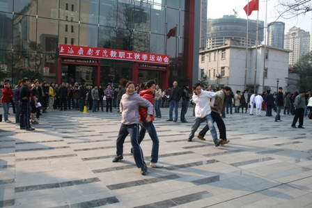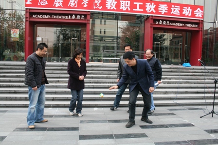 图为校领导为教职工展示了“友谊拍球”表演
