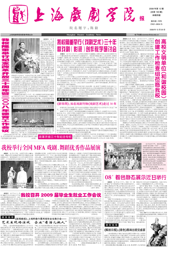 《开云足球首页官网下载报》2008年第12期已出版(总193期)已于12月20日出版。本期重点内容有:《我校隆重举行纪念改革开放三十周年暨二○○八年德育工作会议》、《我校隆重举行《戏剧艺术》三十年暨戏剧(影视)创作教学研讨会》、《高校文明单位(和谐校园)创建工作检查组莅临我校》、《我校举行全国MFA戏剧、舞蹈优秀作品展演》、《我校召开2009届毕业生就业工作会议》、《08’着色静态展示近日举行》等,敬请关注。