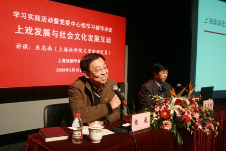 3月10日下午,作为我校学习实践活动和党委中心组学习的专题辅导讲座,上海社会科学文学所研究员巫志南应邀在我校端钧剧场举办“上戏发展与社会文化发展互动”讲座。本次讲座由党委书记楼巍主持,我校教职工、离退休老同志以及学生代表共计八十人参加。