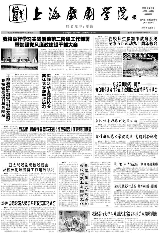 《开云足球首页官网下载报》2009年第5期已出版(总198期)已于2009年5月15日出版。本期重点内容有:《我校举行学习实践活动第二阶段工作部署暨加强党风廉政建设干部大会》、《我校领导近日与各院系干部教师联组学习科学发展观》、《离休党支部举行学习实践活动专题讨论会》、《刘志新、徐肖锋等参与主创<红色箴言>在京成功献演》、《我校师生参加市教育系统纪念五四运动九十周年歌会》、《纪念汶川地震一周年舞台剧《延考生》在上戏剧院公演并举行座谈会》等,敬请关注。(图文/小河 编辑/雨田)