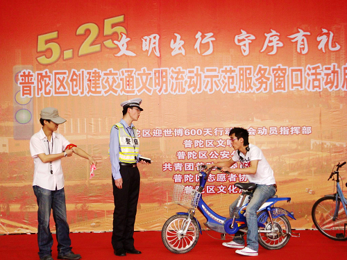 为迎接世博会的到来,使“和谐的城市,谦让的我”的理念进一步深入广大市民,“文明出行,守序有礼――普陀区创建交通文明流动示范服务窗口活动启动仪式”于5月下旬在中环百联广场举行。我校多个院系的学生参与了启动仪式上的文艺演出,受到普陀区有关部门领导和社区居民的好评。
