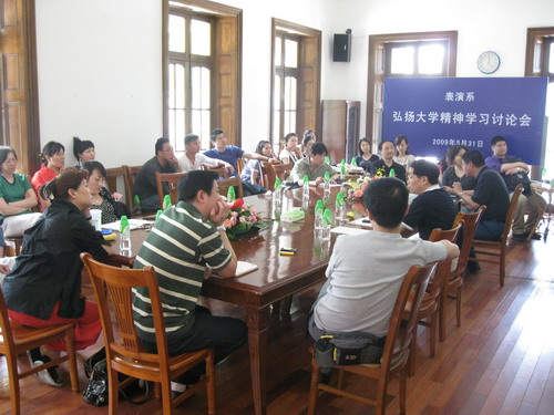 系主任龙俊杰老师首先向大家通报表演系学习科学发展观的情况,表演系经过第一阶段的问题查找,形成了对我系的深入认识,并于第二阶段制定了整改计划,确立了发展方向。龙老师将这一科学发展观学习成果向各位老师逐一汇报,得到广大老师的认同与支持。教师代表王洋与吕岩也就自己的学习心得谈了体会。