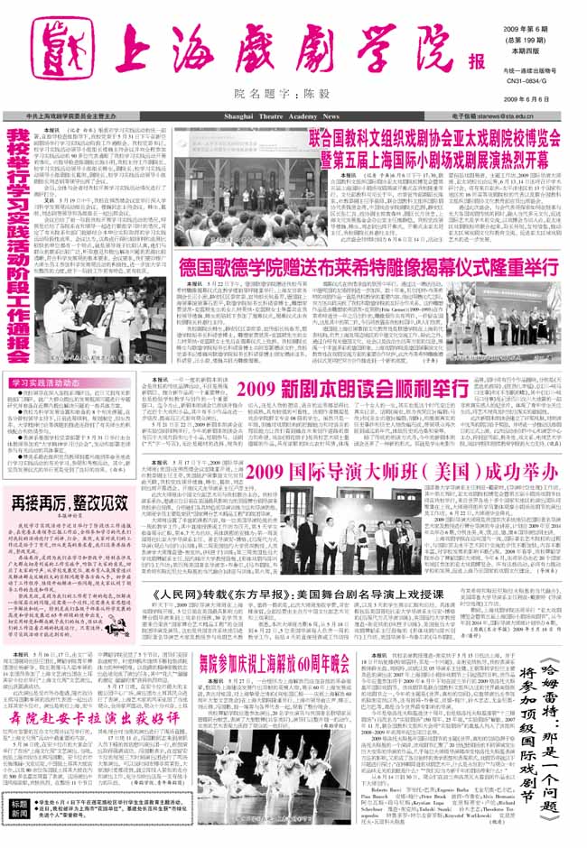 《开云足球首页官网下载报》2009年第6期已出版(总199期)已于2009年6月6日出版。本期重点内容有:《我校举行学习实践活动阶段工作通报会》、《联合国教科文组织戏剧协会亚太戏剧院校博览会暨第五届上海国际小剧场戏剧展演热烈开幕》、《德国歌德学院赠送布莱希特雕像揭幕仪式隆重举行》、《2009国际导演大师班(美国)成功举办》、《舞院赴安卡拉演出获好评》、《<哈姆雷特:那是一个问题>将参加顶级国际戏剧节》、《我校少数民族联合会成立》等,敬请关注。