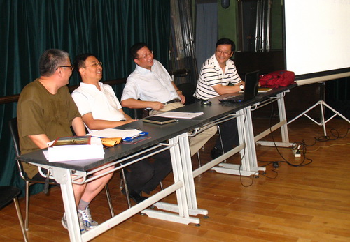 我校党委书记楼巍(左二)与吴小均(右二)、李建平(右一)、王履玮等剧组主创人员一起出席建组和开排仪式并做讲话