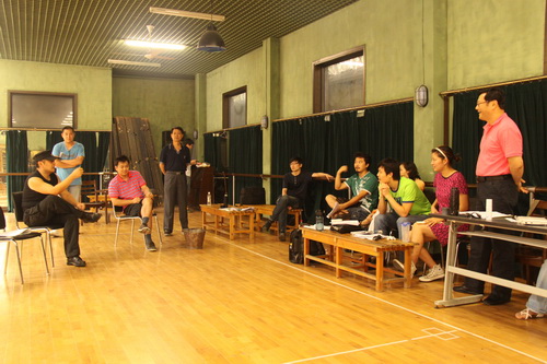图为剧组成员在导演李建平(右一)带领下举行紧张排练