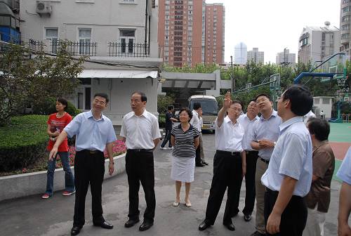 图为静安区四套班子领导在附中领导的陪同下视察学校基础设施