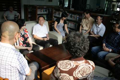 图为党委书记楼巍与中国京剧艺术基金会的领导和理事亲切交谈