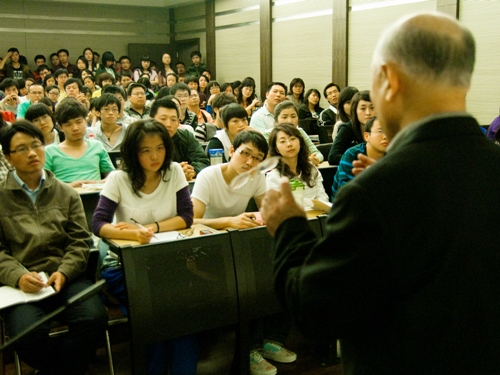 当晚6时30分,红楼209教室已人满为患,学生们早已带着崇敬的心等待着黄老师的到来。当讲座主持赵武副教授陪同老人步入教室的时候,同学们纷纷站立了起来,用掌声表示对黄教授的欢迎。此时黄教授抑制不住激动的心情,说:“其实我是上海人,每次路过上海我都想给上海的孩子们留下点什么以表达我对家乡的热爱和对未来祖国电影接班人的鼓励!”话音刚落,全场再次爆发了掌声。在接下来的讲座中,黄教授从近期中国的电影《建国大业》,《赤壁》等一系列在国内有票房佳绩的电影开始说起,他语出惊人并发人深省。然后引出了中国电影的现代性的开拓这个主题。后又拿出了法国新浪潮的代表电影《四百下》,《广岛之恋》的个别片段,给同学们分析了之中的电影语言,它们深刻地挖掘着人物的内心,并与当时的政治环境紧密相扣。黄教授同时还提出“电影本体回归”和“电影主题意识的觉醒”,认为中国电影目前出现了“后大片”的现象,即一味注重视觉效果而忽略了对民族文化传统及其叙事智慧的深入发觉。但中国电影还是存在着很强大的力量,它是极具希望的。
