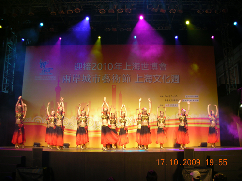 为促进海峡两岸交流,加强沪台两地合作,文化部和上海市政府联合与台北市于2009年和2010年互办“两岸城市艺术节”。由原文化部副部长、中华文化联谊会第一副会长艾青春为团长,上海市文化广播影视管理局局长、上海世博会事务协调局副局长、上海文化联谊会名誉会长朱咏雷和文化部港澳台办副主任、中华文化联谊会副会长于兴义为副团长,上海市文化广播影视管理局副局长、上海电视艺术家协会副主席刘文国为秘书长,率上海170名艺术家赴台参加“迎接2010年上海世博会、两岸城市艺术节、上海文化周”活动。应上海市文广局邀请,我校舞蹈学院以党支部书记顾成明为领队18名师生于2009年10月14日-20日也一同随团赴台参加演出。
