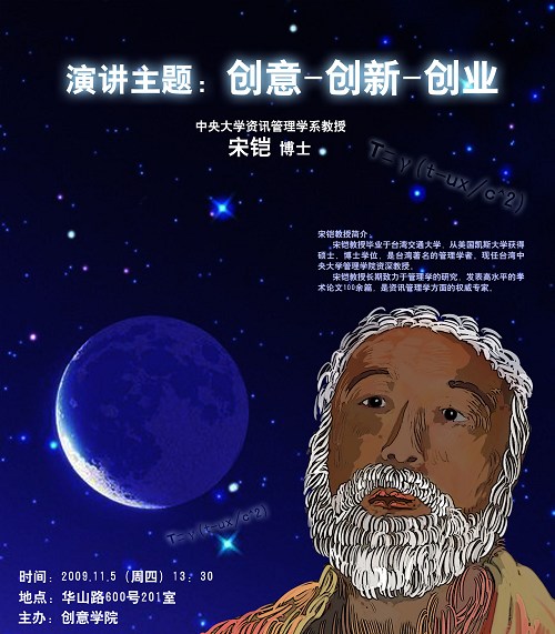 台湾中央大学管理学院院长教授宋铠博士即将于11月5日(周四)下午13:30赴我校创意学院201教室,做题为《创意――创新――创业》演讲,敬请光临。