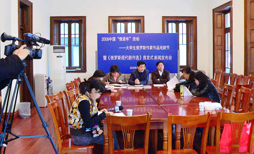 昨天(11月23日)下午,2009中国“俄语年”活动――大学生俄罗斯作家作品戏剧节暨《俄罗斯现代剧作选》首发式新闻发布会在佛西楼老干部活动室举行。副院长孙惠柱、党办副主任黄桂英以及来自新华社、中国教育报社、文汇报、新民晚报、新闻午报、上海人民广播电台等新闻媒体的记者出席发布会。发布会由党委宣传部长张生泉主持。