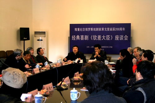 12月7日上午,纪念俄罗斯戏剧家果戈里诞辰200周年――经典喜剧《钦差大臣》座谈会在佛西楼会议室成功举行,院长韩生出席会议并致辞,《钦差大臣》一剧的主创人员陈明正、焦晃、张先衡等,上海外国语大学教授余匡复等来自文化戏剧界的专家学者,以及我校曹树钧、谷亦安、刘明厚、何雁等30余人参加了座谈会。座谈会由副院长孙惠柱主持。