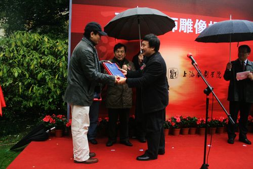 12月10日下午, 继全国版音乐剧《弘一法师》在上海大剧院成功落幕以及青春版音乐剧《弘一法师》成功上演之际,弘一法师雕像揭幕仪式在我校隆重举行。上海文广集团演艺中心副总裁、中国话剧艺术研究会副会长杨绍林, 上海市佛教协会主席觉醒法师的代表慧觉法师,著名表演艺术家俞洛生、张先衡,天津戏剧博物馆前馆长黄殿祺,弘一法师雕像捐赠者、上海城市雕塑艺术中心副理事长郑培光和上海大学美术学院综合材料与公共艺术工作室主任蒋铁骊,我校领导韩生、葛朗及院长助理王宏舟,我校叶长海教授、丁罗男教授、熊源伟教授(音乐剧《弘一法师》导演)、曹路生教授(音乐剧《弘一法师》编剧)、宋怀强教授(音乐剧《弘一法师》主演)和教师、学生代表近百人,一同出席了此次揭幕仪式。揭幕仪式由副院长葛朗主持。