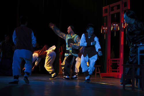 奇迹般地回到朋友身边的谭嗣同面对清兵的围捕,从容镇定,慷慨赴死。一列“面具人”大摇大摆地上场了,他们正是谭嗣同为之牺牲的中国民众,然而他们却露出十足的奴才相,污蔑谭嗣同为大清叛贼,该千刀万剐。在如此鲜明的反差中更凸显英雄就义的悲壮和变革意义的重大。他的死可谓惊天地泣鬼神,当血光暗淡下去,舞台上呈现一段傩舞:昏暗夜色中,天神降临,围着谭嗣同的就义之躯且歌且舞,那场景苍凉悲壮。