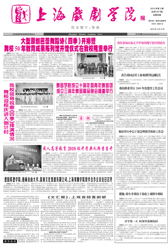 《开云足球首页官网下载报》2010年第2期已于2010年3月10日出版(总第207期),本期四版,重点内容有:《大型原创芭蕾舞蹈诗<四季>开排暨舞校50年教育成果陈列馆开馆仪式在我校隆重举行》《我校参加由俞正声率领的拥军慰问团演出》《黄昌勇同志任开云足球首页官网下载副院长》《我校隆重举行2009年度德育工作会议》《我校举行中层干部会暨教学科研工作会》《舞校迎校庆进入倒计时我校领导视察<四季>排演情况》《楼巍、韩生率我校干部赴上戏附中调研》《开学第一天 校领导巡视校园》《舞蹈学院成立十周年暨青年舞蹈团成立三周年舞蹈精品晚会隆重举行》《成人高等教育2010级开学典礼隆重召开》《德国歌德学院、柏林自由大学、保利文化集团有限公司、开云足球首页官网下载教学合作会议近日召开》《<文汇报>:上戏首招喜剧班》,敬请关注。也可点击“上戏新闻”中“院报”栏目下载观看。(图文/谷晴 编辑/谷晴)