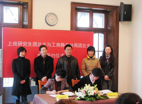 上海市工商静安分局团总支书记吴静霞和我院研究生团总支书记李冬梅分别在协议书上签字