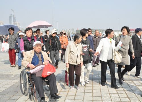 图为老同志正兴致勃勃地参观世博园区