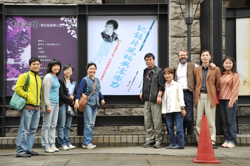 图为原一男与方方师生在海报前合影