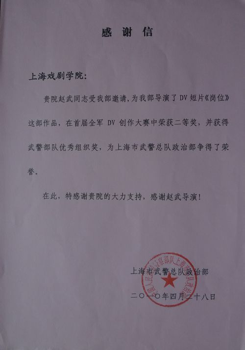 贵院赵武同志受我部邀请,为我部导演了DV短片《岗位》这部作品,在首届全军DV创作大赛中荣获二等奖,并获得武警部队优秀组织奖,为上海市武警总队政治部争得了荣誉。